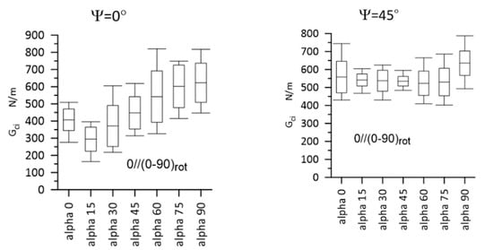 Gci values for Laminate A, for Ψ = 0° and Ψ = 45°. Statistically, a significant difference was detected for Ψ = 0°, for α = 0° vs. α = 90°; α = 15° vs. α = 60°; α = 30° vs. α = 75°; α = 30° vs. α = 90°. The whiskers limit the extreme values, the middle bars represent the mean values, and the boxes represent the standard deviations.