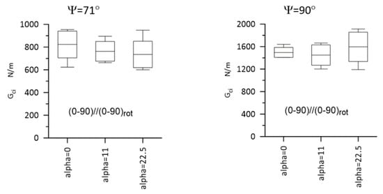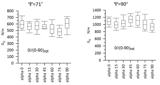 Gci values for Laminate A, for Ψ = 71° and Ψ = 90°. Statistically significant differences were detected for Ψ = 71°, for α = 0° vs. α = 75°; α = 75° vs. α = 90° and for Ψ = 90°, for α = 45° vs. α = 90°. The whiskers limit the extreme values, the middle bars represent the mean values, and the boxes represent the standard deviations.