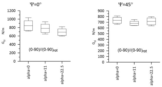 Gci values for Laminate B for Ψ = 0° and 45°. Statistically, a significant difference was detected for Ψ = 0°, for α = 0° vs. α = 22.5°. The whiskers limit the extreme values, the middle bars represent the mean values, and the boxes represent the standard deviations.