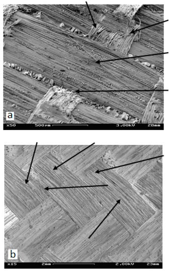 A small number of broken fibers (pointed out by arrows) were located at the strand periphery, indicating that the delamination roughly followed the strands envelope and did not penetrate the strands: (a) Laminate A, (b) Laminate B.