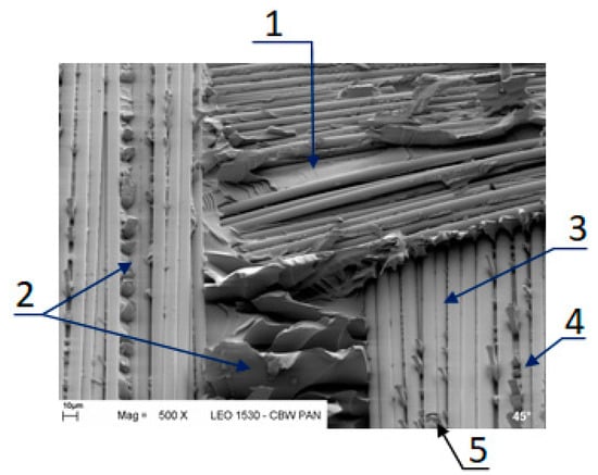 Figure 19 provides some examples of these mechanisms. These include (i) a cohesive fracture of the matrix between the strands and fibers resulting in a flat resin surface, which was marked 1, or in resin cups, marked 2 and 4, (ii) the adhesive fracture at the fiber–matrix interface resulting in a bare fiber surface, which was marked 3, and (iii) the fracture of fibers, which was marked 5. (Detailed discussion of this issue can be found in [41] The extent of each mechanism and its contribution to the delamination growth varied with location and presumably with α, which would be responsible for the variation of Gic with α. Unfortunately, very extensive fractographic investigations would be necessary to verify this hypothesis, as was mentioned. Such studies were out of the scope of this research; nevertheless, they shall be a topic of future investigations.