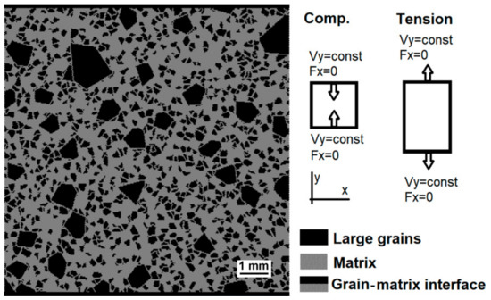 Uniaxial tension and compression of the samples were modelled. For the compressive and tensile tests, the geometry of the model was 1 × 1 cm2 and 1 × 1.5 cm2, respectively (Figure 2). For every loading mode, we considered three “statistically equivalent” samples with different spatial distributions of inclusions but the same percentage of different fractions. The failure at room temperature was modelled.