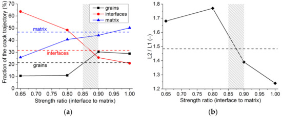 For the models with low interface strength, the portion of the crack trajectory through the interface approaches 0.7 (Figure 7a). The crack jumps from the interface of one large grain to another, producing a trajectory of high non-linearity (L2/L1). For the models where the interface’s strength approaches that of the matrix, the preferred crack propagation route is through the matrix. When a crack meets a grain, it splits it, causing the non-linearity of the crack to become lower (Figure 7b). The best agreement between the parameters of the modelled and experimental crack trajectory is achieved for the interface strength which is 85–90% of the matrix strength.