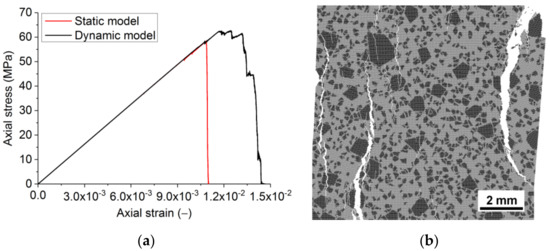 - An acceptable agreement was seen between the loading rate dependencies predicted by the model and average experimental trend typical for brittle and quasi-brittle materials. Particularly, the simulation results showed a non-linear increase of compressive and tensile strength of refractory with increasing strain rate. In both cases, the dynamic strength curves can be approximated by power functions with exponents significantly less than 1. The exponent for dynamic tensile strength is 1.4 times greater than the exponent for dynamic compressive strength. These results correlate well with experimental data on diverse heterogeneous ceramic-based materials, including concretes and rocks. Experimental data show that, first, the dependences DIF () are power functions with exponents usually around 0.5, and, second, the exponent for tensile DIF is up to two times greater than for compressive DIF [50,51,52,53]. The simulation results also indicate a transition from localised fracture (single macrocracks) to multiple fractures (branching network of mesocracks) and a progressive increase in the degree of sample fragmentation with increasing strain rate. The effect is especially pronounced at > 101 s−1. This is also in good agreement with the dynamic test results of diverse quasi-brittle porous materials. Finally, it is pertinent to mention the increase in the number of broken mesoscopic hard inclusions at high strain rates observed in experiment and simulation (the trend from crack propagation around the inclusions to cutting them).