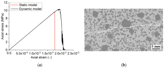 Under tension and compression, the modelled material had a Young’s modulus of 5.5 GPa (Figure 4). Thus, the selected elastic characteristics of the constituents (Table 1) produce an acceptable representation of Young’s modulus, as seen in the lab tests. However, the obtained strength was an order of magnitude lower than the experimental values. Furthermore, the numerically obtained strength ratio UCS/UTS ≈ 3.8 is lower than the experimental value of approximately 5 (Figure 1).