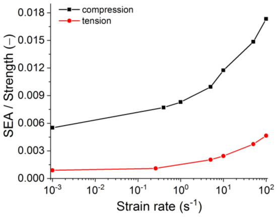 The dependence of the ratio of specific energy absorption to strength on the strain rate.