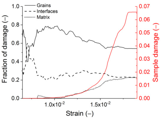 Contributions of constituents to the sample damage accumulation during dynamic compressive loading. The strain rate is 5 s−1. The red curve is the absolute sample damage.