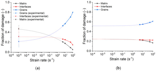 Figure 16 reveals how the contributions of constituents to the fracture of refractory samples alter with a strain rate increase. Here are the “final” values of fractions corresponding to fractured samples.