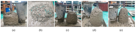 (a) Slump test for plain mix; (b) fresh wet mix of WFN fiber-reinforced concrete. Slump test for fresh mix of WFN fiber-reinforced concrete: (c) 1% WFN fiber-reinforced concrete; (d) 2% WFN fiber-reinforced concrete; (e) 3% WFN fiber-reinforced concrete.