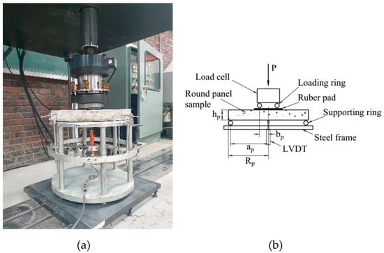 In this study, the BFT was conducted using a 500 kN hydraulic UTM. The round panel sample (D420 × 48 mm2) was supported by a steel frame. The diameter of the support ring was 400 mm (aP = 200 mm), and that of the loading ring was 100 mm (bP = 50 mm). Notably, for the high consistency of the observations, a rubber pad was placed between the sample surface and the loading ring to maintain the flat condition of the sample surface. In addition, an LVDT was attached to the steel frame to measure the deflection of the central point of the sample (see Figure 4). According to the linear elasticity theory [42], the equibiaxial flexural stress was calculated using Equation (3) as follows: