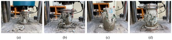 Failed cylindrical concrete samples in compressive strength test: (a) Plain concrete; (b) 1% WFN fiber-reinforced concrete; (c) 2% WFN fiber-reinforced concrete; (d) 3% WFN fiber-reinforced concrete.
