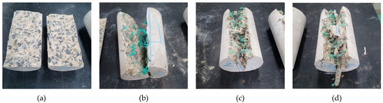 Failed cylindrical concrete samples from the splitting tensile strength test: (a) Plain concrete; (b) 1% WFN fiber-reinforced concrete; (c) 2% WFN fiber-reinforced concrete; (d) 3% WFN fiber-reinforced concrete.