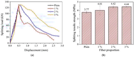 Splitting tensile strength test results: (a) Splitting load–displacement curves; (b) splitting tensile strength.