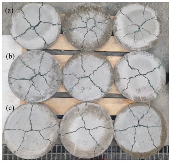 Tensile fiber of round panel concrete samples: (a) WFN samples with fiber-reinforced concrete proportions of (a) 3%; (b) 2%; (c) 1%.