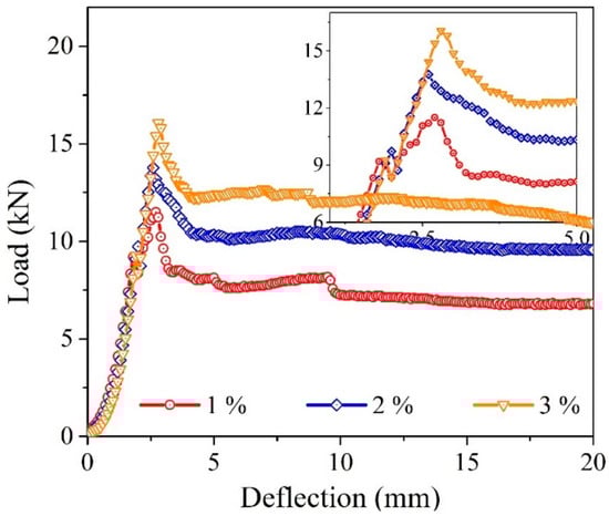 Figure 9 illustrates the failed samples from the BFT with different WFN fiber volume proportions. The deflection-hardening behavior and consistency load-deflection response were observed as shown in Figure 10 [48]. As indicated by the crack patterns, the flexural failure mode can be observed for the WFN samples with a fiber-concrete proportion of 1% (Figure 9c), while both flexural failure and punching failure modes can be observed for samples containing 2% and 3% WFN fibers (Figure 9a,b). Small and large cracks can both be observed in the failed WFN samples with fiber-reinforced concrete proportions of 2% and 3%, while only larger cracks were observed in the failed 1% WFN fiber-reinforced concrete samples. In addition, the numbers of cracks in the failed samples of the two test cases were more than that of the 1% WFN fiber-reinforced concrete sample. Thus, the role of fiber proportions is clarified. Similar to the above observations from the splitting tensile strength test, the WFN fibers showed their efficient role in bridging cracks, withstanding load, and delaying the development of crack propagations that improved the ultimate strength of materials. The higher efficiencies associated with higher fiber proportions can also be observed from these failure patterns. The literature review showed that the normal concrete samples were fractured and had no effective post-cracking ductility [39,49]. The samples were broken into two or three pieces separately, and the direction and the location of the first crack were random. When a crack occurs at peak load, the load suddenly drops to zero. Hence, this study only focused on the fiber-reinforced concrete samples.