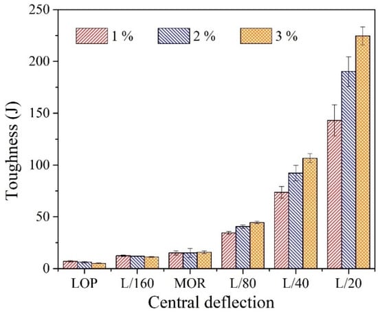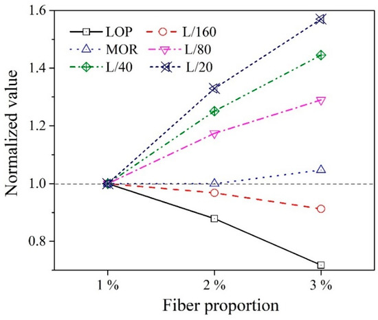 Figure 11 summarizes the toughness from the biaxial flexural test corresponding to central deflections and fiber proportions. The toughness values at the points LOP, L/160, and MOR were unchanged regardless of the fiber proportions. For instance, the mean value of toughness of each variable at the points LOP, L/160, and MOR are observed to be equal to 6, 12, and 15 J, respectively. However, different toughness values were observed at the points L/80, L/40, and L/20, and their order increased as a function of the fiber proportions. For instance, the toughness values at the points L/20 were 143, 190, 225 J, respectively. On the basis of these observations, the efficiencies corresponding to the different fiber proportions were estimated by the normalized analysis based on the toughness values of the 1% WFN fiber-reinforced concrete sample (see Figure 12). As indicated, at LOP, all the test samples showed a decrease in the toughness ratio with an increase in the proportion of fibers. This may be attributed to the fiber additions, which degraded the performance of the ITZ as reported above. A lower decrease is observed at the point L/160; thus, demonstrating the influences of fiber proportions on the toughness performance after the first crack occurred. After MOR, the toughness performances of all test samples yielded higher increases, which corresponded to the increase in fiber proportions. This is attributed to the fact that the twisted geometry of WFN fibers improved the bond between the fibers and the cement matrix. Therefore, toughness was improved at higher fiber proportions.
