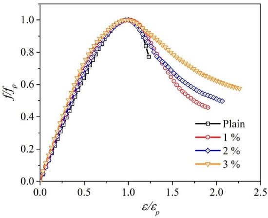 According to the literature, polymeric fibers have been reported to reduce concrete compressive behavior because of the creation of additional defects in the cement matrix generated following a reduction in the matrix compactness. Consequently, the addition of polymeric fibers weakens the interfacial transition zone (ITZ) [43,44]. Fiber effectiveness was only activated after a crack occurred. Considering the post-peak stage in Figure 5a, the descending slope of the stress-strain curves is softened by the presence of fibers. In addition, an increase in peak strain was observed. These observations are clearer when the proportion of fibers is increased. Therefore, the toughness increases considerably. The toughness can be computed by the area under the stress-strain curve [45] relevant to Equation (4) and Figure 5a. The results are listed in Table 6. A study by [43] considered the effectiveness of steel fibers on the mechanical characteristics of concrete. A slight reduction in compressive strength was reported when steel fibers were added to the concrete. In addition, the role of steel fibers in softening the constitutive curve after the peak load, as well as its effect on flexural toughness, were observed. Similar findings pertaining to decreasing compressive strength and increasing strain at the peak load have been published by Choi and Yuan [46]. These authors added the same proportions (1% and 1.5%) of glass fibers and polypropylene fibers in concrete. The observation at 28 days showed a decrease in compressive strength as compared with that in the plain paste from 12 to 27%. Hence, the post-cracking behaviors of the WFN fiber concretes were similar to those reported in the literature.