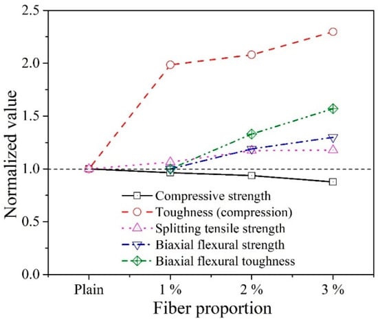 Normalized analysis of strength and toughness based on plain concrete, and biaxial flexural strength and toughness based on 1% WFN fiber-reinforced concrete sample.
