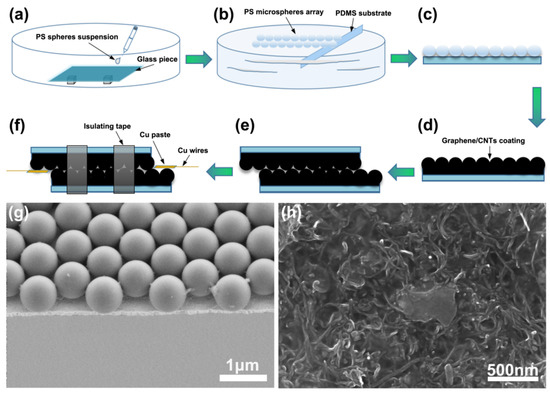 Before pouring onto the monolayer PS spheres array, a weight ratio of 2:1 (graphene to carbon nanotube) was well mixed (Figure 1d). To guarantee that the coating’s thickness was consistent, it was necessary to dip into a small amount of the graphene/CNTs solution with a thin plastic rod and apply it evenly on the PS microsphere array. Then, the sample was put into a 60 °C oven (DL-101, Zhonghuan Experimental Electric Furnace Co., Ltd., Tianjin, China) for 10 min.