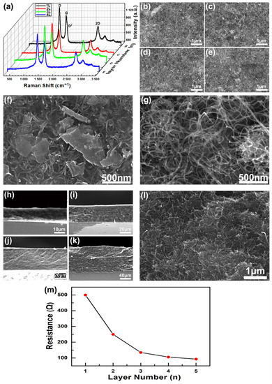 Characterization of graphene/CNTs conductive coating. (a) Raman spectra of graphene/carbon nanotube conductive coatings with different layers, respectively. (b–e) SEM image of 1~4-layer graphene/CNTs conductive coating surface. (f) SEM image of sheet-like multilayer graphene on conductive coating. (g) SEM image of multi-walled carbon nanotubes on conductive coating. (h–k) SEM side view of 1–4 layer graphene/CNTs conductive coating. (l) High magnification SEM side view of the conductive coating. (m) Relationship between the number of conductive coating layers and the resistance value of conductive layer.