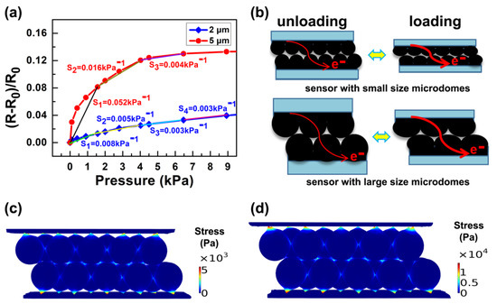 The pressure-sensing abilities of the manufactured pressure sensors based on 5 µm and 2 µm diameter PS spheres are investigated by measuring relative resistance changes. The pressure sensitivity (S) may be calculated using the formula , where P signifies the applied pressure, and R and R0 signify the resistance change with load pressure and beginning resistance without pressure or load, respectively. The relative differences in resistance of the pressure sensors based on 5 µm and 2 µm diameter PS sphere are shown in Figure 3a. When the sensor is subjected to the same pressure, the microstructure film with the bigger characteristic size will experience more significant deformation and a large relative change in resistance, as shown in Figure 3b. To explore the dimensional influence of dome-shaped structures on sensor performance systematically, the sensitivity within the low-pressure region may be approximated as: