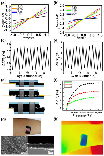 Figure 4a,b shows the pressure sensor’s current–voltage (I–V) curves at the various radius of curvature. As the voltage is swept from −1 V to 1 V, the applied pressure remains constant. The slopes of the I–V curves reduce as the degree of bending increases, showing that resistance increases as curvature increases. The linearity of the I–V curves implies that Ohm’s contact properties dictate the device’s behavior. Among them, Figure 4a is the I–V curve of the pressure sensor without the PS microsphere array, and Figure 4b is the I–V curve of the PS microsphere array pressure sensor with a diameter of 2 μm. The resistance of the former increases by 11 times during the process from natural extension to bending to a radius of curvature of 5 cm. In the latter, under the same conditions, the resistance is increased by 5 times. Obviously, the interlocked microstructured sensor is more sensitive than the planar surface sensor. The curve of the resistance change rate of the pressure sensor without the PS microsphere array during the bending process is shown in Figure 4c, and Figure 4d is the resistance change rate curve of the pressure sensor with a 2 μm diameter PS microsphere array during the bending process. Three different pressure sensors were prepared, namely, single plane type, single microdome type and interlocking microdome type based on 2 μm diameter microspheres (Figure 4e), in order to study the influence of the surface micro-structure on sensor sensitivity. Figure 4f shows a comparison of their electrical resistance changes when subjected to external pressure, corresponding to the three curves: a, b, and c. Although all of them display an increase in resistance as pressure rises, the interlocking microdome sensors’ responses differ significantly from those of the planar sensor. In reaction to pressure, we can notice a considerable reaction for the microstructured sensors. When the pressure is applied to 18,000 Pa, the resistance change rate of the interlocked microdome sensor is 5.87%, which is significantly higher than the resistance change rate of the non-structured sensor 2.29% and the single-microstructured sensor 3.83%. However, when the applied pressure is in the range of 18,000~40,000 Pa, as the pressure increases, the sensor resistance increases relatively slowly and tends to be stable. The PDMS flexible substrate of the pressure sensor has good adhesion to human skin (Figure 4g). In addition, as shown in Figure 4h, the graphene/CNTs hybrid coating of the pressure sensor can effectively absorb infrared rays. Therefore, the flexible pressure sensor possesses extensive use outlooks in wearable medical monitoring devices, electronic skin, artificial intelligence, and soft robotics [23].