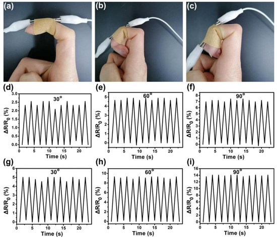 The graphene/CNTs pressure sensor was fixed on the finger through a band-aid to monitor the bending motion of the joint at different angles (Figure 5a–c). At the same time, real-time resistance changes were recorded (Figure 5d–i). The resistance change rate of the pressure sensor without the PS microsphere array in the cyclic bending of the finger at different angles is shown in Figure 5d–f. Figure 5g–i corresponds to the resistance change rate of the pressure sensor with a 2 μm diameter PS microsphere array. It was found that the resistances of the sensor showed corresponding increases or decreases with the deformation of the finger. Furthermore, under the same conditions, the resistance change rate of the interlocking microstructure sensor was almost twice that of flat surface sensor.
