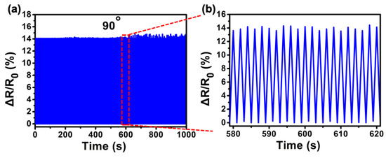 (a) The sensor is tested for 90° bending for 480 cycles. (b) The 21 cyclic tests extracted from the red region in (a).