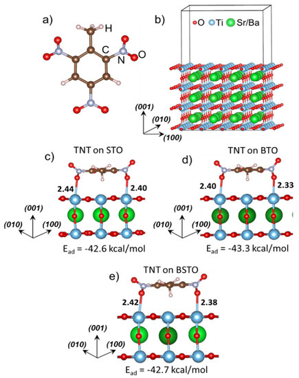 Based on energetic considerations, the TNT molecule is strongly adsorbed on the TiO2-terminated (001) perovskite surface by forming bonds between oxygen atoms of nitro groups and surface Ti cations (Figure 1c–e). In the most favorable configuration, the aromatic ring is situated parallel to the terminating plane. Energies of TNT adsorption on all three perovskites, BTO, STO, and BSTO, are very close to each other (approximately −43 kcal/mol, Figure 1c–e, Table 1) largely due to a similarity of interactions between TNT and TiO2 surface atoms, characteristic for these perovskites. The high binding energies imply that TNT can be interfaced with the perovskites, forming stable structures. At the same time, a single TNT molecule absorbed on the perovskite surface serves as a good model system to explore properties of the interfaces as intermolecular interactions. These interactions are neglected in such a model, since they are relatively weak because they are mostly defined by van der Waals forces while all electronic density is fully localized on the molecules.