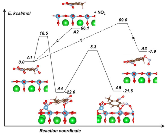 Intriguingly, we discovered surface-facilitated chemistry, which proceeds very differently. We will now illustrate and analyze the dramatic effect of the perovskite surface on mechanisms and kinetics of TNT decomposition. A very small perturbation that moves the adsorbed TNT molecule closer to the BSTO surface triggers the C-NO2 break (reaction A1–A4, Figure 3) with only 18.5 kcal/mol, which is three to four times lower than the experimentally measured activation barrier of the condensed-phase TNT decomposition (67.3 kcal/mol [15]) and the calculated gas-phase energy (58 kcal/mol [68]). More so, the reaction is exothermic and releases 22.6 kcal/mol of energy (Figure 3, Table 1). Both products of the reaction remain on the surface. Breaking of the second C-NO2 bond (A4–A5, Figure 3) is a more demanding process in comparison with the previous step and requires 30.9 kcal/mol, and the reaction step A4–A5 is energetically neutral. A similar reaction in the isolated gas-phase TNT molecule requires 124.5 kcal/mol overall [68], which is again about four times higher than that on the perovskite surface.