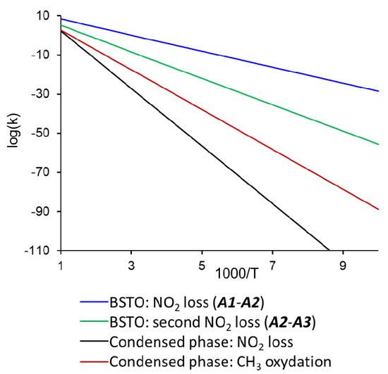 The reaction rates of the simulated surface-enhanced decomposition mechanisms are plotted in Figure 4 and clearly demonstrate that all the reactions procced at considerably higher rates than the known reported condensed-phase TNT decomposition [4,15]. Among the probed reactions on the BSTO surface, the primary C-NO2 bond break (A1–A4, Figure 4) is kinetically the most favorable reaction due to the lowest activation energy of 18.5 kcal/mol and relatively high pre-exponential factor of log(A, s−1) = 12.3. The breaking of the second C-NO2 bond (A4–A5, Figure 4) proceeds at lower rates due to a higher activation barrier (30.9 kcal/mol) and lower pre-exponential factors (log(A, s−1) = 11.9). Since breaking of the second C-NO2 bond (A4–A5) is an endothermic process, A5 will eventually convert back to A1.