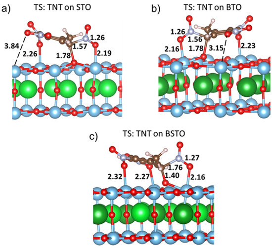 Further, we repeated similar calculations on two relevant perovskite surfaces, BTO and STO. The calculated energies are collected in Table 1 and show that TNT decomposition on BTO and STO requires close barriers, 23.8 and 24.5 kcal/mol, and both energies are slightly higher than that on BSTO (18.5 kcal/mol). The decomposition of TNT on the STO surface has a slightly higher pre-exponential factor log(A, s−1) = 13.1 than on BTO (log(A, s−1) = 12.2) and BSTO (log(A, s−1) = 12.3) as shown in Table 1. Table 1 also indicates that the C-NO2 bond cleavage on the STO surface yields a significantly lower reaction energy gain (3.7 kcal/mol) than on BTO (25.1 kcal/mol) and BSTO (22.6 kcal/mol). The observed trends may be explained with the analysis of the transition state structures (Figure 5). The transition states of the TNT C-NO2 bond-breaking reaction on the STO and BTO (001) surfaces have similar structures (Figure 5a,b) while the transition state on BSTO (Figure 5c) has a different configuration. For example, in comparison with STO and BTO, the TNT molecule on BSTO has a shorter C-O bond (1.40 Å vs. 1.78 Å) and a longer C-N bond (1.76 Å vs. 1.57 Å, Figure 5a–c). Further, on STO and BTO surfaces, a bond is formed between the surface Ti atom and one of the nitro groups (Figure 5a,b) whereas on the BSTO surface (Figure 5c), two nitro groups bind with surface Ti atoms. Hence, the TNT molecule at the transition state interacts with the BSTO (001) surface more strongly than with STO and BTO surfaces. As a result, TNT decomposition on BSTO requires somewhat lower energy than on STO and BTO.