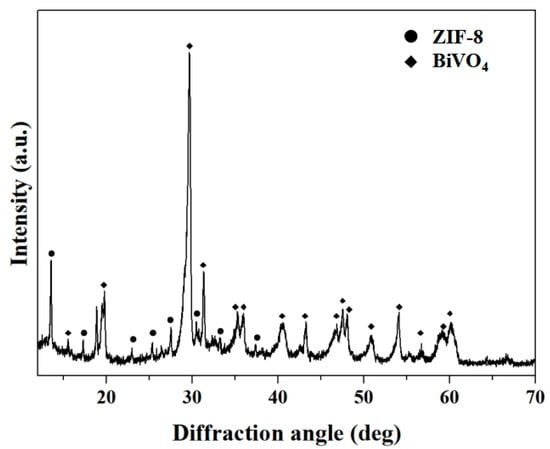 The XRD pattern of BiVO4@ZIF−8. The diffraction peaks are assigned to BiVO4 and ZIF−8 as indicated.