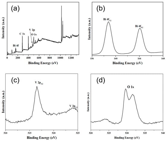 XPS (seen in Figure 3a) showed that only Bi, V, C and O existed in as-prepared BiVO4. Figure 3b,c show the characteristic peaks for Bi3+ and V5+ in BiVO4. The binding energies of Bi 4f7/2 and Bi 4f5/2 were 158.5 and 164.4 eV, respectively, and the binding energies of V 2p3/2 and V 2p1/2 were 516.5 eV and 524.3 eV, respectively, consistent with previous reports [36,37]. The appearance of the C 1s signal at 284.8 eV might be an instrument error during the XPS test. It is noticeable that, in Figure 3d, the O 1s peaks were split into two peaks, which correspond to the O element in the BiVO4 crystal lattice (528.9 eV) and O2 absorbed via BiVO4 (532.5 eV).