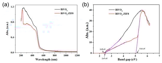 The property of light absorption was another crucial factor that affected the photocatalytic properties of BiVO4 and BiVO4@ZIF−8. Therefore, ultraviolet–visible absorption spectra were applied to characterize the light absorption abilities of BiVO4 and BiVO4@ZIF−8. From the spectra in Figure 5, we can see that the absorption edges of pure BiVO4 and BiVO4@ZIF−8 composites were all around 500 nm. Tauc’s equation, as shown in Equation (2), was applied to determine the band gap value of semiconductors with a direct band gap: