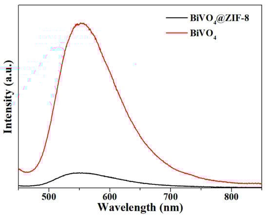 When the photogenerated electrons and holes are recombining, strong photoluminescence signals will occur and can be detected via PL spectra, as shown in Figure 6. The PL spectra of BiVO4 and BiVO4@ZIF−8 were both excited at 365 nm, which corresponded to a photon energy of 3.39 eV, and was larger than the band gap of both BiVO4 (2.47 eV) and BiVO4@ZIF−8 (2.35 eV). This energy was strong enough for both BiVO4 and BiVO4@ZIF−8 to excite valence electrons to the conduction band. As shown in Figure 6, the specific peak intensities of BiVO4@ZIF−8 at 540 nm were much weaker than those of pure BiVO4. The weaker PL intensity indicated that the recombination of photogenerated electrons and holes was largely suppressed in the BiVO4@ZIF−8 composite, which was conducive to enhancing photocatalytic performance [40].