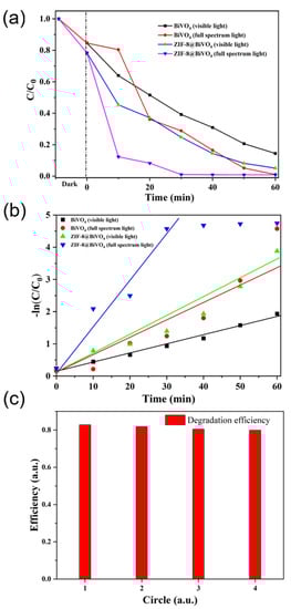 (a) The photodegradation efficiency of BiVO4 and BiVO4@ZIF−8 under full-spectrum and visible light. In the presence of BiVO4-ZIF 8, more than 90% of RhB is degraded after 60 min of visible light irradiation, while only 80% of RhB is degraded in the presence of pure BiVO4. (b) The value of ln (C0/C) vs. time for RhB degradation; BiVO4@ZIF−8 shows a higher kinetic constant with the value of 0.133 min−1. (c) The reproducibility test of photocatalysis.