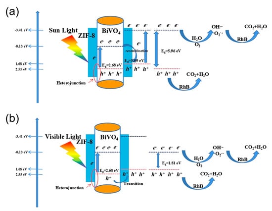 The mechanism of the enhanced photocatalysis performance of BiVO4@ZIF−8 could be further explained by its band gap structure. The positions of the CB and VB for BiVO4 and ZIF−8 are clearly shown in Figure 8. For the BiVO4@ZIF−8 heterojunction structure, the VB and CB positions of BiVO4 are all much more positive than those of ZIF−8 (the CB and VB positions are −0.13 eV and 2.55 eV for BiVO4, respectively, and −3.41 eV and 1.68 eV for ZIF−8, respectively). Hence, we may discuss the enhancing mechanism under both UV light and visible light. When irradiated under UV light, the photogenerated electron–hole pairs can be generated from both BiVO4 and ZIF−8 at the CB and VB, respectively. Owing to the closer position of the CB of BiVO4 and the VB of ZIF−8, the electron at the conduction band of BiVO4 and the hole at the valence band of ZIF−8 tend to recombine with each other more easily. Therefore, the e- and h+ of BiVO4@ZIF−8 only remain at the CB of ZIF−8 and the VB of BiVO4, respectively, which indicates that the band gap width of BiVO4@ZIF−8 is extended to 5.96 eV. The O2−· at the CB of ZIF−8 has higher energy than that of BiVO4; therefore, BiVO4@ZIF−8 is more beneficial for RhB degradation. When irradiated under visible light, due to the larger band gap of ZIF−8, the photogenerated electron–hole pairs can only be excited at the BiVO4 surface. As the VB of ZIF−8 is more negative than that of BiVO4, the covalent Bi-O-Zn at the heterojunction could play a role that transfers the holes at the VB of BiVO4 to the VB of ZIF−8 and hinders the recombination of the photogenerated electron–hole pairs [45]. In addition, the processes of degradation often occur at the surfaces of photocatalysts; in the BiVO4@ZIF−8 composite, ZIF−8, with its mesoporous structure and large surface area, has more active sites for h+ to form free radicals to photodegrade RhB. Thus, BiVO4@ZIF−8, with its larger surface area and heterojunction structures, exhibited better photocatalysis performance.