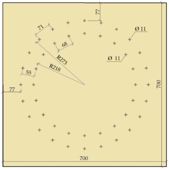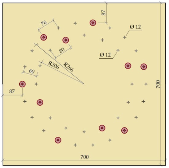 This experiment consisted of creating a frame connection between the post and the beam using bolts and pins with a diameter of 12 mm. The material of the fasteners was steel of class 8.8. The arrangement of the bolts and pins was on two symmetrically centered circles. Circle 1 had radius r1 = 266 mm, and there were 22 fasteners on it. Circle 2 had radius r2 = 206 mm, and there were 16 fasteners on it. The joint geometry and detailed arrangement of the screws is shown in Figure 2.