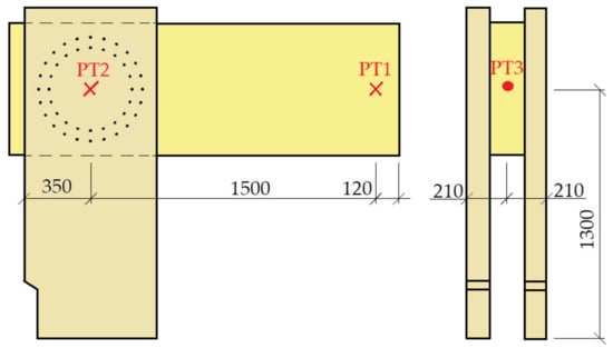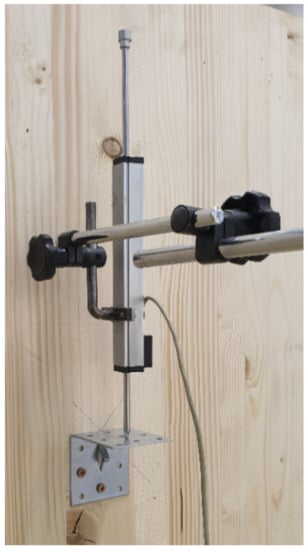 Two sensors were placed on the cross-sectional axis of the beam. One was at the end of the free end of the beam, under the load (press head), and the other was placed in the middle of the frame corner (see the cross points in Figure 5). Due to the location of these two deformation sensors, we were able to measure and calculate the actual vertical deviation of the measured points. It was necessary to fit another deformation sensor to the structure. It was mounted on the post, specifically on the imaginary axis of the beam. This sensor recorded the horizontal tilt of the construction (see the full point in Figure 5).
