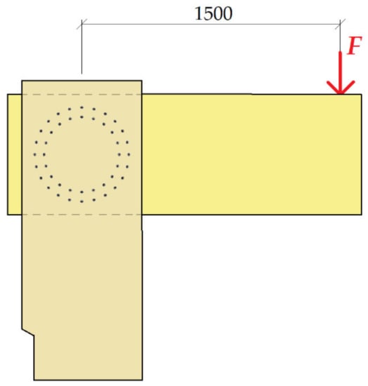 This experiment consisted of creating a frame connection of the post and the beam using full-threaded screws. The diameter was 11 mm, and the length of the screw was 400 mm. The material of the screw was steel class 10.9. The arrangement of the screws was on two symmetrically concentrated circles, where circle 1 had radius r1 = 273 mm, and there were 24 screws on it. Circle 2 had radius r2 = 218 mm, and there were 20 screws on it. The joint geometry and detailed arrangement of the screws are shown in Figure 3.