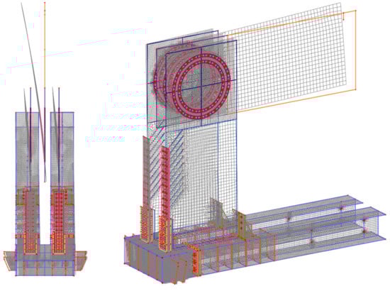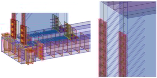 For the experiment of test sample no. 1, two concepts for the computational model were used for numerical modeling. Both approaches to numerical modelling are based on the finite element method. The first concept of numerical modelling is focused on verifying the stability calculation. The computational model consists of shell and beam (rod) finite elements. The detail of the computational model and the finite element mesh is shown in Figure 7. The computational model was processed down to the details of the connecting elements, which are evident in Figure 8 and Figure 9. The connection between the connecting elements and the wood was in the form of stiffening springs (beam), as can be seen in Figure 10b. SCIA Engineer software [45] was used for the calculations. The computational model had 82,793 2D finite elements and 3970 1D finite elements. In total, the computational model had 80,277 nodes, and 481,662 equations were solved. The performed calculations were used to verify the stability of the whole system before the experiment.
