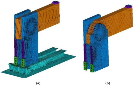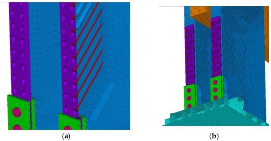 The goal of the computational models was to simulate the behavior during the test experiment. Again, the computational model was processed down to the detail of the fasteners, as shown in Figure 12a,b.