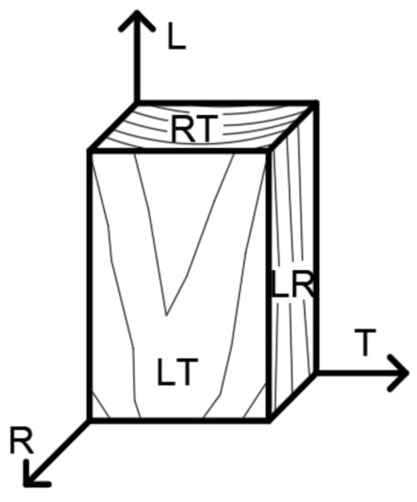 The material model of wood was defined in the system of rectangular coordinates L, T, and R (see Figure 13) by nine elastic constants, which were the modulus of elasticity in the direction of fibers EL; modulus of elasticity in tangential direction ET; modulus of elasticity in radial direction ER; modulus of elasticity in shear GLT, GLR, and GTR; and the Poisson factors of transverse deformation νLT, νLR, and νTR (see Figure 13).
