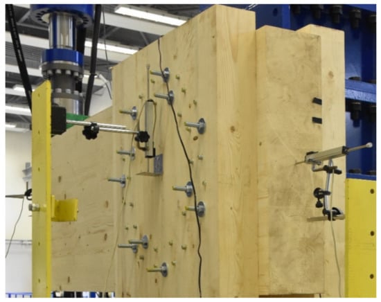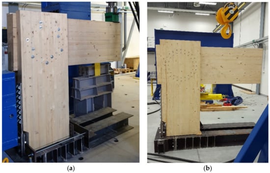 Wood is an important building material that can be used in all applications of construction tasks. However, in some respects, it requires specific approaches, such as testing of mechanical properties and classification [1,2]. It is also possible to use specific dynamic testing [3] or the vibration acoustic method [4]. The diagnostics of existing structures and the determination of mechanical properties are closely related to the testing of mechanical properties [5]. The current possibilities of wood processing technology and design of structures allow a wide range of applications from simple structures, through multi-story buildings [6] to long-span structures [7]. However, it is important to take into account the experience from previous accidents and structural failures in design and analysis [8]. For a correct understanding of the behavior and design of wooden structures, it is appropriate to use experimental tests of structural details [9,10,11] or structural parts, such as entire frames [12]. For example, the use of numerical modeling based on the finite element method is also very important [13,14,15]. It is most often used to determine rotational stiffness, overall load capacity, or failure mechanism. It is also possible to simulate dynamic loading [11]. Typical experiments include, in particular, frame corner [16], timber-to-timber joints [17], connection/joint [18], and detail [19] experiments.