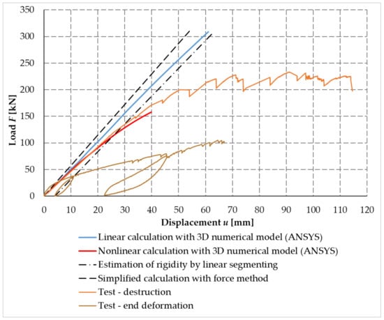 To perform experiments, it can be noted that the choice of loading (force/deformation) must be chosen individually with respect to a particular experiment (structure/part of the structure). From the point of view of design standards, the force load is more suitable for the linear area of loading. Deformation load, which is usually also used in numerical modeling in nonlinear analysis, is more suitable for determining the overall course of the experiment. It is possible to combine both approaches of loading (force/deformation), but this is suitable for tests that are repeated several times. The Newton Raphson Method and deformation load were used in the nonlinear calculation. Therefore, the same method was chosen for the experiments. The basic/initial process of loading was determined according to the standard in [43]. The structure was first loaded to about 40% of the characteristic load capacity, the value of which was calculated according to the standard in [40] and the professional literature [41]. Subsequently, the construction was lightened. This was followed by a second cycle in which the load was about 70% of the characteristic load capacity. This step was followed by loading until the structure was damaged. Table 1 shows the load values shows the load curve for experiment setup test no. 1 on bolts and pins fasteners, determined according to [44]. Table 2 shows the load values shows the load curve for experiment setup test no. 2 on screw fasteners, determined according to [44]. The resulting loading process is clearly visible in the resulting load–displacement diagrams.