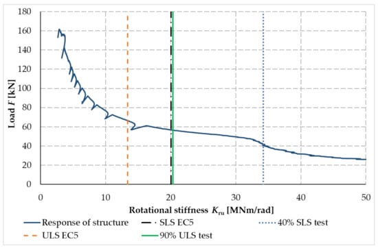 Figure 27 shows the calculated process of the rotational stiffness of the fasteners. The blue solid curve shown in Figure 27 is the course of rotational stiffness, the value of which is influenced by the magnitude of the applied load. The orange dashed line represents the value of rotational stiffness calculated for the ultimate limit (ULS) state according to [40,41]. The green solid line shows the actual measured value for 90% of the ultimate limit state (ULS) load capacity limit value. The black dashed line with one dot shows the calculated value for the serviceability limit state (SLS) and the blue dotted line shows the actual rotational stiffness value measured for 40% of the SLS load value for the serviceability limit state.