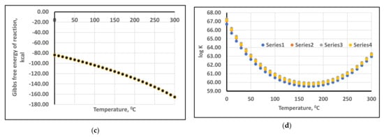 where: Ln-La, Nd, Sm and Gd, (a) denominates the ionic species in aqueous solutions and the stoichiometric coefficients correspond to the highest 8 wt.% Ln as dopants. The estimation has been done using the HSC Chemistry v.10 software and database (Outotec, Pori, Finland). The results are presented in Figure 1a–d. The values obtained for the enthalpies, entropies and Gibbs free energies in Figure 1a–c are very close for the four lanthanides considered in this thermodynamic study, with a difference < 1 kcal.