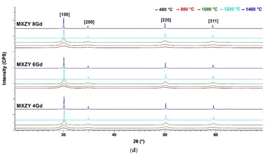 After the hydrothermal synthesis process, for the assessment of phase stability, the powders MxZY 4/6/8% La, MxZY 4/6/8% Nd, MxZY 4/6/8% Sm and MxZY 4/6/8% Gd, were subjected to calcination at various temperatures (400 °C/800 °C/1000 °C/1200 °C/1400 °C, respectively) for 60 min and their phase compositions were analyzed.