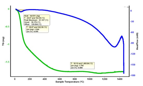 Thermal analysis was used to analyze the thermal stability of powder and phase transformations during thermal treatment of hydrothermally synthesized powders. As an example, the TG and DSC graph of the MxZy4%Gd powder heated from ambient temperature to 1450 °C is shown in Figure 5, with the specification that the graphs of the other powders are similar. The mass losses for each individual system revealed in the TG curve are shown in Table 4.